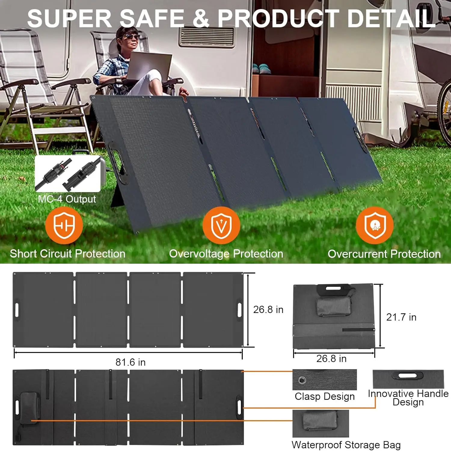 ENVIRONMENTAL DURABILITY: Featuring upgraded integrated lamination technology, waterproof Oxford cloth and ETFE coating, the 200W foldable solar panel offers IP65 waterproof, dustproof and long-lasting durability to withstand harsh weather conditions. Ideal for outdoor activities such as camping, hiking, picnics, caravans, motorhomes, etc.